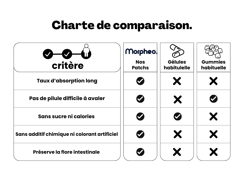 Les patchs transdermiques Morpheo agissent comme le soleil en libérant progressivement des ingrédients naturels à travers la peau, régulant ainsi votre cycle de sommeil et favorisant une relaxation optimale.